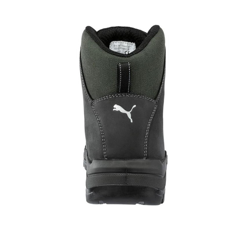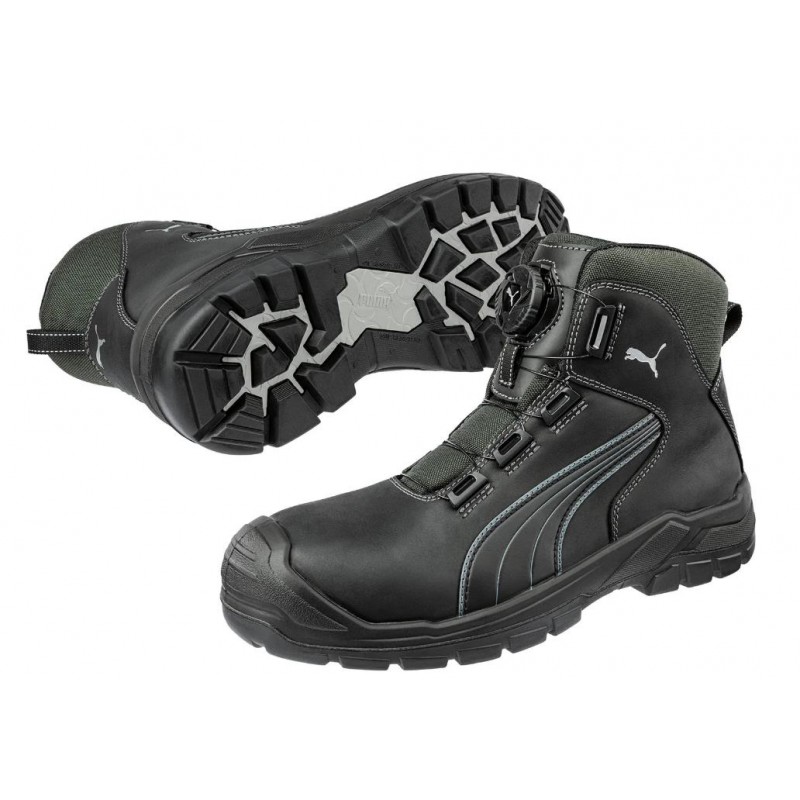Chaussures de sécurité PUMA Cascades Disc mid S3, avec fermeture à molette, tige en cuir de vachette graissé et Cordura® résistant, sans métal, avec embout en fibre de verre et protection anti-perforation FAP® LITE, antidérapantes, résistantes à la chaleur jusqu'à 300 °C, semelle autonettoyante.